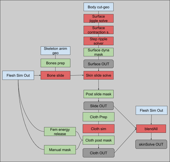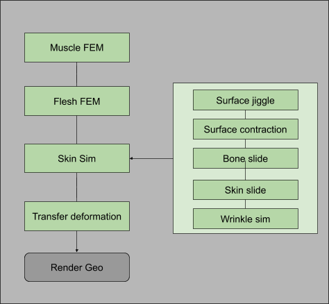 - Deform the skin based on simulation output and optionally blend it with the input animation for enhanced results.